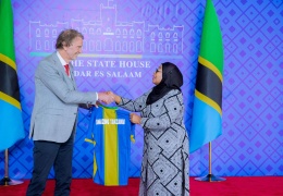 Posted on: April 11th, 2025 Rais wa Jamhuri ya Muungano wa Tanzania, Mhe. Dkt. Samia Suluhu Hassan akimkabidhi zawadi ya picha pamoja na Jezi ya Timu ya Taifa Tanzania (Taifa Stars) yenye Ujumbe wa, “Amaizing Tanzania” kwa Mmili...